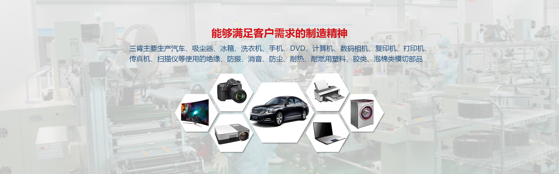 主要生産汽車毛氈類的熱壓産品及材料,針刺毛氈,無紡布以及家電辦(bàn)公類設備(bèi)使用的絕緣、防振、消音、防塵、耐熱、耐燃用塑料、膠帶、泡棉類模切部品。